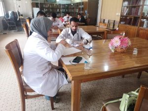 بإشراف الأستاذ الدكتور علي كريم خضير الجبوري عميد كلية التمريض ومتابعة الأستاذ المساعد الدكتور سلمان حسين فارس معاون العميد للشؤون العلمية والدراسات العليا والأستاذ المساعد الدكتور فاطمة مكي محمود معاون العميد للشؤون الإدارية والمالية في كلية التمريض بحضور الأستاذ الدكتور خميس بندر عبيد رئيس فرع تمريض الأطفال وعدد من أعضاء اللجنة الإمتحانية أدى طلبة المرحلة الثالثة للدراستين الصباحية والمسائية في كلية التمريض اليوم الأثنين الموافق 9 / 1 / 2023 الامتحانات العملية النهائية الحضورية للكورس الدراسي الأول للعام الدراسي الحالي 2022 -2023 لمادة ” تمريض الأطفال ” فرع تمريض الأطفال وبطريقة المجاميع المصغرة والتي تستمر لأكثر من يومين . إعلام كلية التمريض