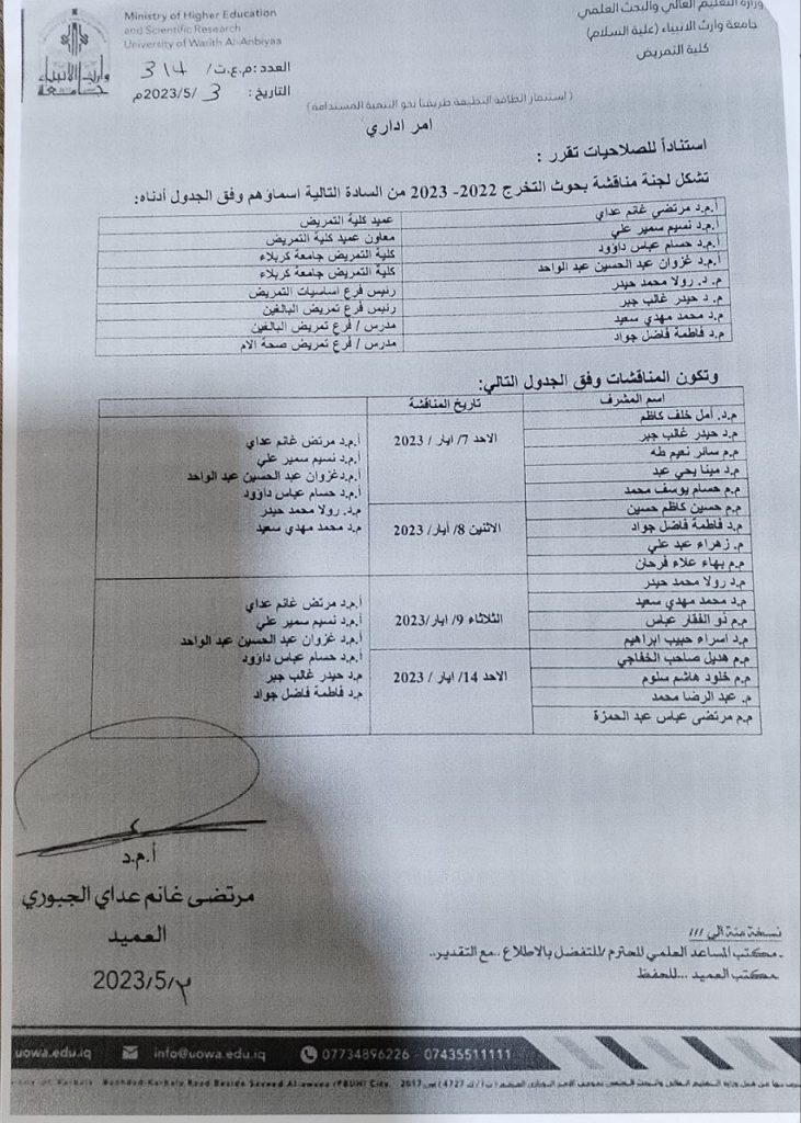 بتوجيه من الأستاذ الدكتور علي كريم خضير الجبوري عميد كلية التمريض بجامعة كربلاء شارك الأستاذ المساعد الدكتور حسام عباس داود والأستاذ المساعد الدكتور غزوان عبد الحسين عبد الواحد بلجنة مناقشة بحوث تخرج طلبة المرحلة الرابعة كلية التمريض بجامعة الوارث عليهم السلام للعام الدراسي 2022 – 2023 ضمن اتفاقية توأمة وتعاون مشترك بين كلية التمريض بجامعة كربلاء وكلية التمريض بجامعة وارث الأنبياء (ع) التابعة للأمانة العامة للعتبة الحسينية المقدسة . من الجدير بالذكر ان كلية التمريض بجامعة كربلاء أعلنت يوم الثلاثاء الموافق 2 آيار 2023 توقيع اتفاقية توأمة وتعاون مشترك مع كلية التمريض بجامعة وارث الأنبياء (ع) التابعة للأمانة العامة للعتبة الحسينية المقدسة في مجال تطوير الخطط والمفردات وتوحيد المناهج الدراسية للتخصصات المتناظرة , وتبادل الكتب والمصادر ضمن التخصصات المشتركة مع إمكانية اقامة الورش التدريبية لتطوير مهارات التدريسيين والفنيين والتعاون في مجال التدريب الصيفي والاشراف على مشاريع تخرج طلبة الصفوف المنتهية والتعاون في استخدام المختبرات والقاعات الدراسية . وتهدف الإتفاقية إلى تعزيز التعاون العلمي والفني وتبادل الخبرات والإفادة من تجارب الكليتين في جميع برامجها العلمية والتربوية لتحقيق الأهداف العلمية المشتركة لرفع المستوى العلمي وزيادة الرصانة العلمية من خلال إستثمار القدرات والإمكانات البشرية والمادية والعلمية المشتركة .