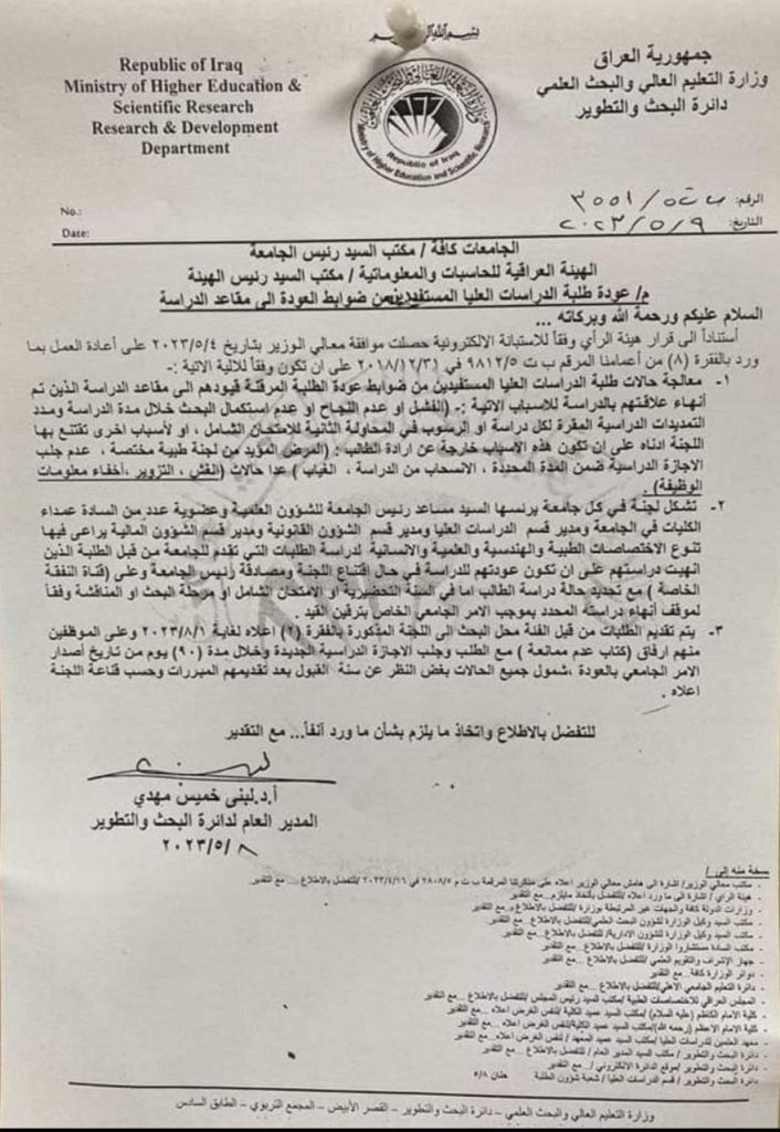 هام جداً… وزارة التعليم العالي والبحث العلمي تعلن عودة طلبة الدراسات المستفيدين من ضوابط العودة إلى مقاعد الدراسة. مدير الموقع 3 سنوات ago