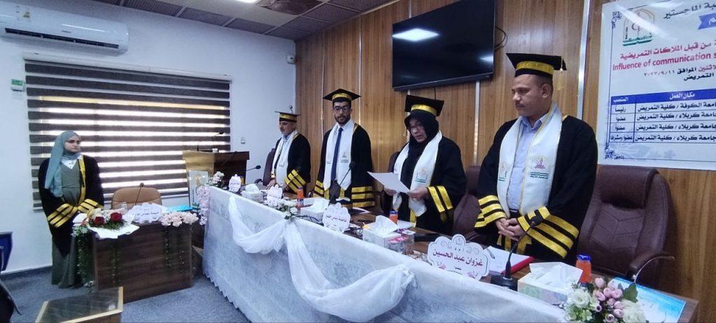 برعاية الأستاذ الدكتور علي كريم خضير الجبوري عميد كلية التمريض بجامعة كربلاء نوقشت رسالة ماجستير في كلية التمريض بجامعة كربلاء اليوم الأحد الموافق 10 أيلول 2023 لطالبة الماجستير( أميمة عباس جاسم ) عن رسالتها الموسومة : ” تأثير مهارات التواصل على اساليب ادارة النزاعات المستخدمة من قبل الملاكات التمريضية “. Influence of communication skills on conflicts management styles used by nursing staff بمشاركة أعضاء إختصاص في علوم التمريض والمتمثلة بالأستاذ الدكتورة فاطمة وناس خضير التدريسية في كلية التمريض جامعة الكوفة والاستاذ المساعد الدكتور غزوان عبد الحسين عبد الواحد رئيس فرع صحة المجتمع والدكتور حقي أسماعيل منصور أحد تدريسيي كلية التمريض والأستاذ المساعد الدكتور سلمان حسين فارس معاون العميد للشؤون العلمية والدراسات العليا في كلية التمريض عضواً ومشرفاً وجرت المناقشة على قاعة المناقشات في بناية كلية التمريض . إعلام كلية التمريض
