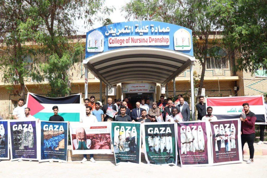 بالصور / كلية التمريض بجامعة كربلاء تنظم وقفة تضامن ومساندة مع الشعب الفلسطيني وأبناء شعبنا الصابر في غزة ” العزة والكرامة “. إعلام كلية التمريض