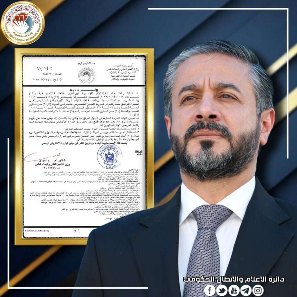 أصدر وزير التعليم العالي والبحث العلمي الدكتور نعيم العبودي أمرا وزاريا بتعيين (320) من حملة الشهادات العليا والأوائل على ملاك مركز الوزارة استنادا إلى القرارات والتشريعات النافذة.
